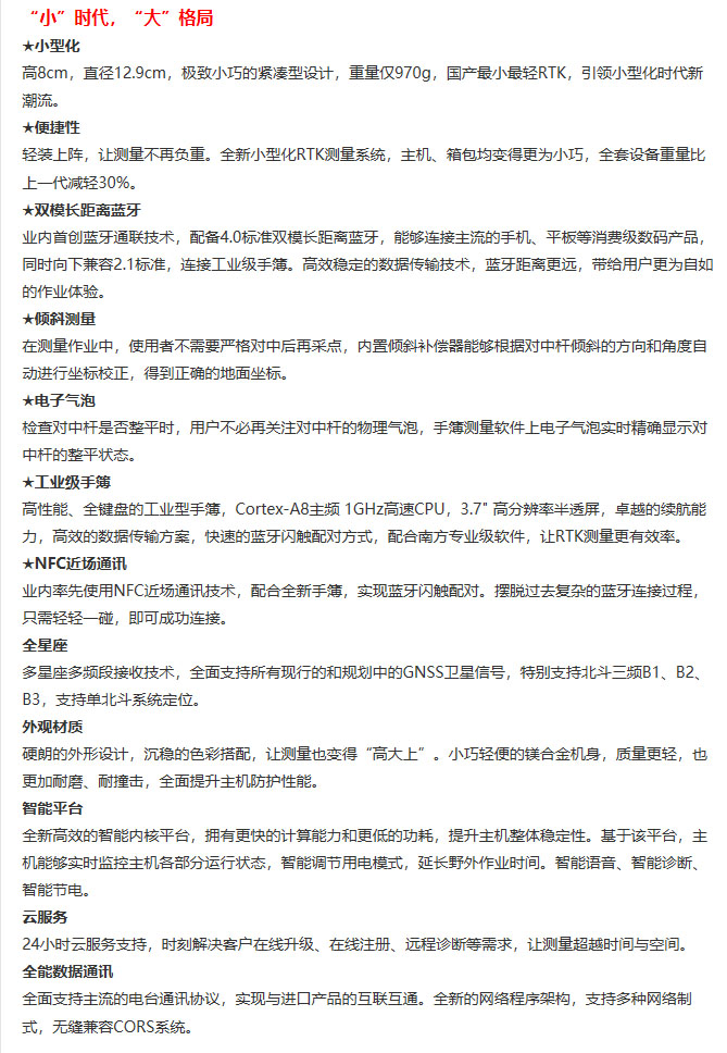 南方全新“银河1”RTK测量系统,集出色的工艺设计、卓越的测量性能、先进的惯导技术于一身,小巧身躯却拥有不凡性能,为您奉上快捷、高效、放心的测量体验,感受信息化时代的科技魅力!